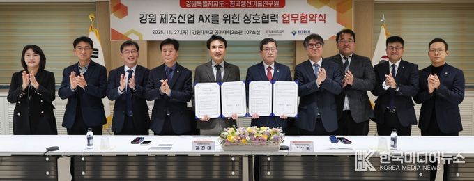 [ 한국미디어뉴스 이원영 기자 ] 강원특별자치도는 11월 27일 오후 3시, 강원 제조산업의 AX(AI Transformation, 인공지능 전환)를 위한 상호 협력을 강화하기 위해 한국생산기술연구원(원장 이상목)과 업무협약(MOU)을 체결했다.