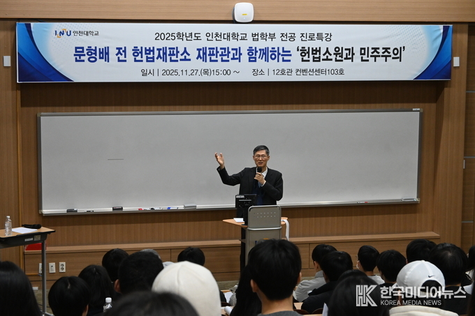 [ 한국미디어뉴스 이원영 기자 ] 인천대학교 법학부는 지난 11월 27일 인천대학교 송도캠퍼스 교수회관 세미나실에서 문형배 전 헌법재판관(헌법재판소장 권한대행 역임)을 초청해 ‘헌법소원과 민주주의’를 주제로 전공 진로특강을 개최했다고 밝혔다.