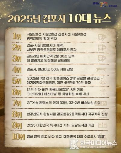 김포시는 지난 11월 7일부터 24일까지 네이버 설문조사 폼을 통해 교통, 교육, 문화, 복지, 관광 등 다양한 분야 20개 정책을 대상으로 ‘2025년 김포시 10대 뉴스’ 온라인 투표를 실시했다. 올해 10대 뉴스는 총 218명의 시민이 참여해 후보 21개 중 최대 5개까지 중복 선택하는 방식으로 선정됐다.