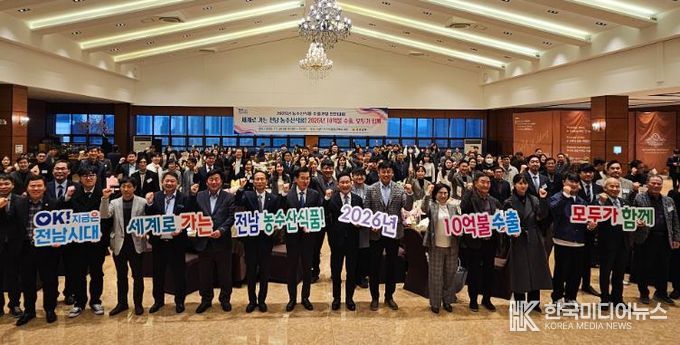 [ 한국미디어뉴스 이종철 기자 ] 전라남도는 28일 남악 스카이웨딩컨벤션에서 농수산 수출기업, 수출 유관기관 등 200여 명이 참석한 가운데 ‘2025 농수산식품 수출기업 전진대회’를 열어 2026년 수출 10억 달러 달성 결의를 다졌다.