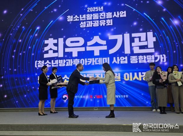 [ 한국미디어뉴스 김풍옥 기자 ] 증평군청소년수련관(관장 김병노) 방과후아카데미가 ‘2025년 청소년방과후아카데미 사업 종합평가’에서 최우수기관으로 선정돼 11월 28일 청소년활동진흥원 이사장상을 수상했다.