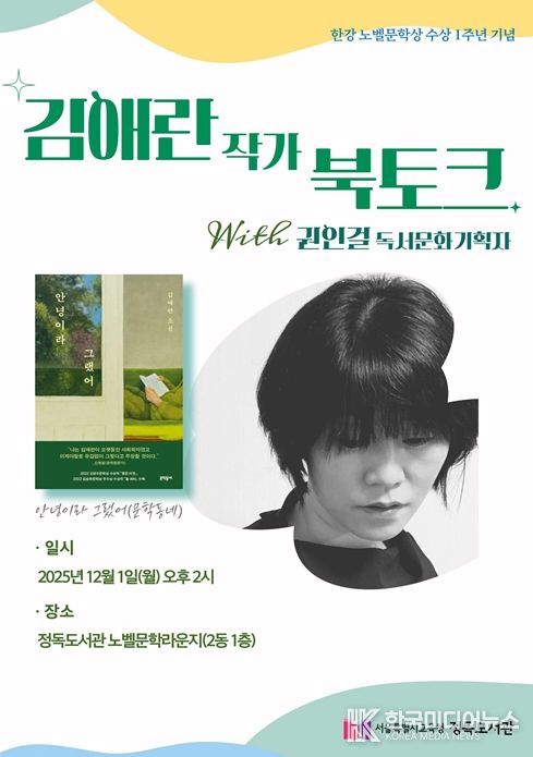 [ 한국미디어뉴스 이원영 기자 ] 서울특별시교육청 산하 정독도서관(관장 엄동환)은 한강 작가의 노벨문학상 수상 1주년을 기념하여, 오는 12월 '노벨문학라운지 북토크'를 개최한다. 이번 행사는 한국문학을 대표하는 작가와 시민이 한 공간에서 작품 세계를 깊이 탐구하고 문학적 감정과 사유를 공유할 수 있도록 마련됐다.