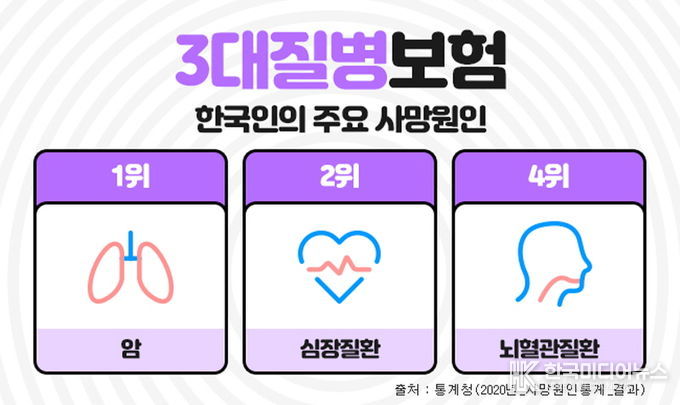 [ 한국미디어뉴스 이원영 기자 ] 한국인의 주요 사망원인중에 암, 뇌혈관질환, 심혈관질환은 흔히 3대질병이라 일컬어지며 살아가면서 가장 먼저 대비해야 하는 중대질병으로 항상 강조되고 있다. 이들 질병에 미리 대비하기 위해 가입하는 것이 진단비보험인데, 이러한 3대질병진단비를 중점으로 보장하는 보장성보험이 3대진단비보험 이다. 3대질병진단비보험은 각각의 질병에 주목해서 보장하기도 하지만, 나에게 맞는 추가 특약을 잘 골라서 가입한다면 종합건강보험으로도 충분히 활용도가 높다.