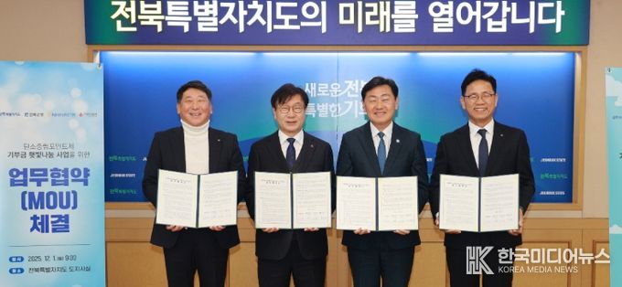 전북도는 1일 도청에서 전북은행, 농협은행, 전북사회복지공동모금회와 ‘탄소중립 햇빛나눔 업무협약’을 체결하고, 기후위기 취약계층을 위한 새로운 에너지 복지 모델을 선보였다. 이날 협약식에는 김관영 도지사, 오현곤 전북은행 부은행장, 김성훈 농협은행 전북본부장, 한명규 전북사회복지공동모금회장이 참석해 사업 취지와 향후 협력 방향을 공유했다.