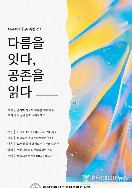 [ 한국미디어뉴스 이원영 기자 ] 인천광역시교육청중앙도서관은 12월 2일부터 28일까지 1층 다문화체험존에서 다문화 특별 전시 ‘다름을 잇다, 공존을 읽다’를 진행한다.