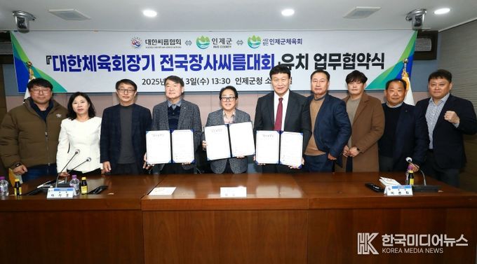 [ 한국미디어뉴스 이원영 기자 ] 인제군과 대한씨름협회, 인제군체육회가 12월 3일 ‘대한체육회장기 전국장사씨름대회’ 유치를 위한 업무협약을 체결했다.