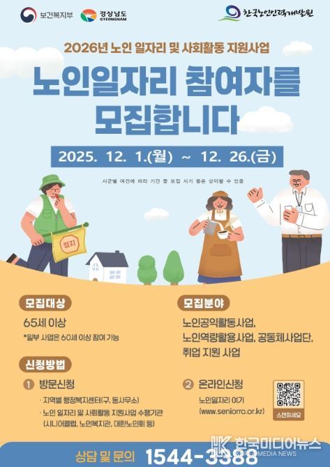 [ 한국미디어뉴스 이원영 기자 ] 경상남도는 어르신의 활기차고 건강한 노후생활을 위해 ‘2026년 노인일자리 및 사회활동 지원사업’ 참여자를 모집하고 있다고 밝혔다.
