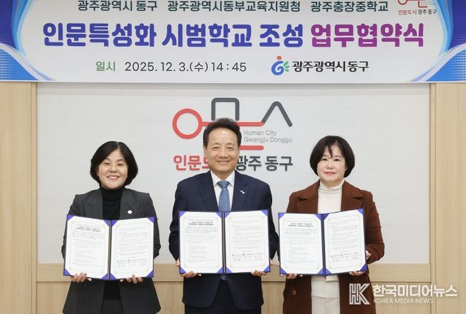 [ 한국미디어뉴스 이종철 기자 ] 광주 동구는 2026년 새롭게 기획한 인문특성화 학교 추진을 위해 지난 3일 광주동부교육지원청, 광주충장중학교와 ‘인문 특성화 시범학교 운영을 위한 업무협약’을 체결하고 지역 인문교육 활성화를 위한 협력 기반을 구축했다고 밝혔다.