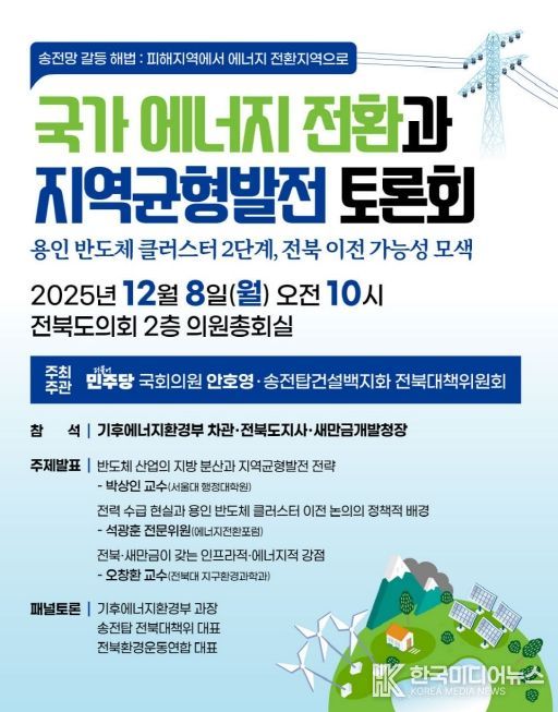 [ 한국미디어뉴스 이원영 기자 ] 안호영 국회의원이 전북 송전탑 갈등 해결을 위한 새로운 국가적 해법을 제시하기 위해 오는 12월 8일 오전 10시 전북도의회에서 ‘송전망 갈등 해법’ 토론회를 개최한다. 이번 토론회는 전북 전역에서 장기간 이어져 온 송전선로 갈등을 국가 에너지전환·지역균형발전의 관점에서 재정의하겠다는 취지로 마련됐다.