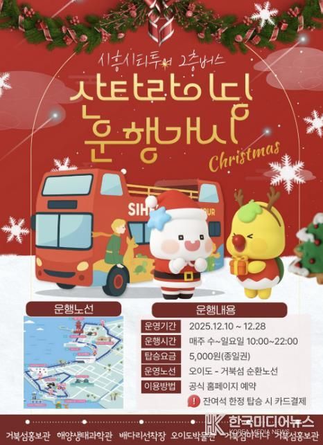 [ 한국미디어뉴스 이보영 기자 ] 시흥시는 연말을 맞아 오이도~거북섬을 순환하는 2층 버스에 크리스마스 테마를 적용한 특별 운행 ‘산타라이딩’을 12월 10일부터 운영한다. 이번 테마 운행은 겨울철 해양 관광 활성화와 연말 분위기 조성을 위해 조성을 위해 마련된 것으로, 12월 28일까지 운행되며 상황에 따라 기간은 연장될 수 있다.