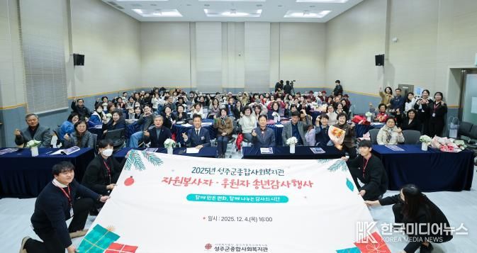 [ 한국미디어뉴스 이원영 기자 ] 성주군종합사회복지관에서는 12월 4일, 한 해 동안 지역사회 복지 향상에 헌신한 이들에게 감사 인사를 전하는'2025년 자원봉사자 및 후원자 송년감사행사' 를 개최했다.