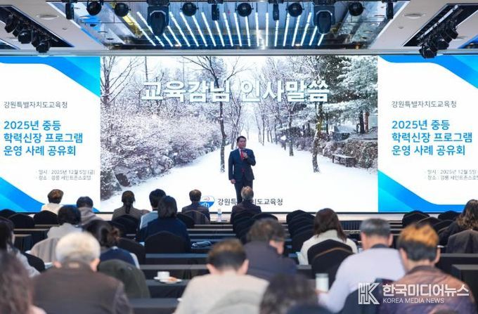 [ 한국미디어뉴스 이원영 기자 ] 강원특별자치도교육청은 12월 5일 강릉 세인트존스호텔에서 도내 중·고등학교 교사 및 교감을 대상으로 ‘2025년 중등 학력신장 프로그램 운영 사례 나눔 연수’를 개최했다.