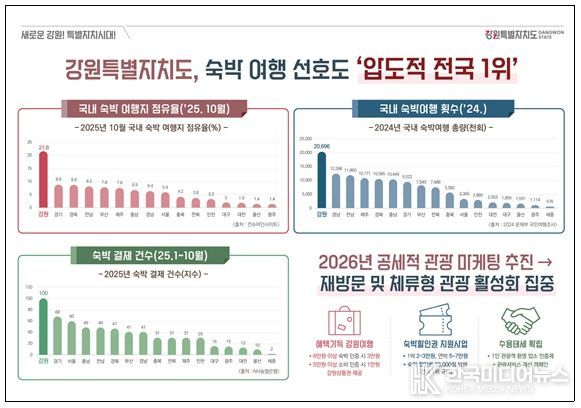 김진태 도지사는 “최근 국내 숙박여행 선호도 조사에서 강원도가 21.6%로 압도적인 1위를 기록했다”며, “내년에도 관광 인프라 확충은 물론 ‘강원 방문의 해’ 캠페인을 통해 더 많은 관광객이 강원을 찾을 수 있도록 열심히 노력하겠다”고 밝혔다.