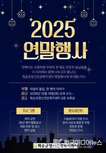박미라 화순군보건소장은 “이번 연말 행사를 통해 정신장애인 및 가족의 사회적 고립감이 완화되는 계기가 되기를 바라고, 지난 한 해를 돌아보며 서로를 격려하고, 2026년을 행복하게 맞이할 수 있기를 바란다”라고 전했다.