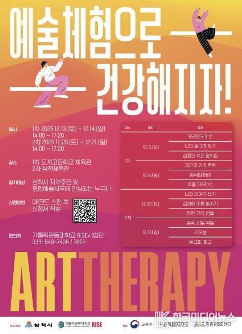 [ 한국미디어뉴스 이원영 기자 ] 삼척시는 가톨릭관동대학교 RISE 사업단과 협력하여 지역 자연자원을 활용한 ‘융합예술치유 프로그램’을 오는 12월 도계고등학교 체육관과 삼척체육관에서 개최한다.