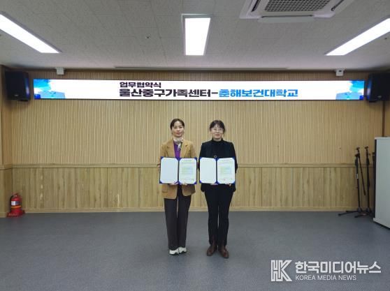 [ 한국미디어뉴스 이원영 기자 ] 울산중구가족센터와 춘해보건대학교 글로벌케어과가 12월 10일 오후 2시 울산중구가족센터 다목적실에서‘산학 공동발전 지역 멘토기관’ 업무협약을 체결했다.