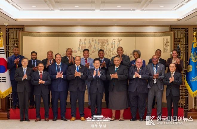 [ 한국미디어뉴스 이원영 기자 ] 이재명 대통령은 12월 10일 오전, 대통령실에서 제6차 한-태평양도서국 외교장관회의 참석을 위해 방한한 태평양도서국 외교장관 일행을 접견했다.