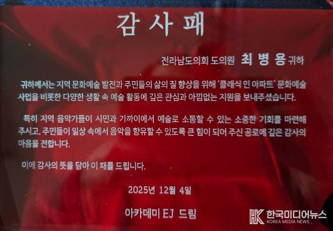 [ 한국미디어뉴스 이종철 기자 ] 전라남도의회 최병용 의원(여수5, 더불어민주당)이 지역 문화예술 발전과 주민 삶의 질 향상에 기여한 공로를 인정받아 지난 4일 지역 예술교육 기관인 ‘아카데미 EJ(대표 이은주)’로부터 감사패를 수상했다.