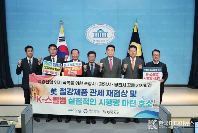 12일 서울 국회 소통관에서 열린‘당진·포항·광양 철강도시 공동기자회견’에서 세 도시는 미국의 고율 철강제품 관세 재협상과‘K-스틸법’ 시행령 마련을 중심으로 한 범정부 차원의 특단 대책을 요구했다. 이날 기자회견에는 당진·포항·광양 3개 도시 시장, 국회의원, 상공회의소 회장단 등 주요 관계자들이 참석했다.
