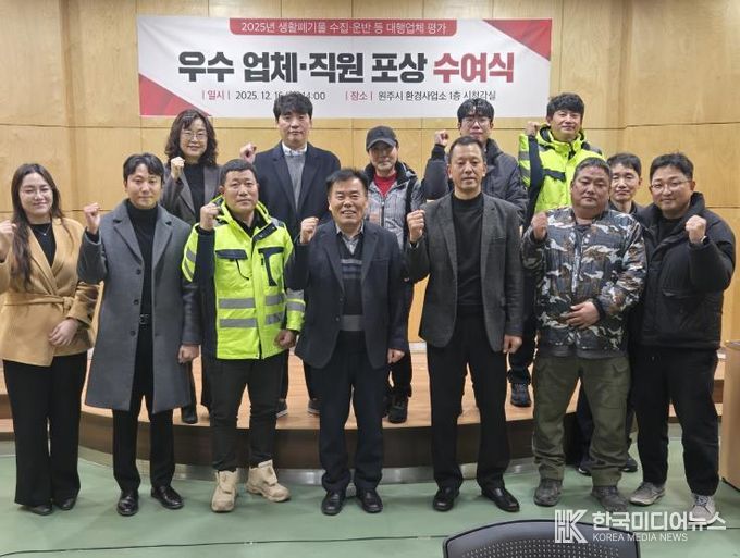 [ 한국미디어뉴스 이원영 기자 ] 원주시는 12월 16일 '2025년 생활폐기물 수집ㆍ운반 대행업체 평가결과'에 따른 우수등급 업체 및 소속 직원을 대상으로 원주시장 상장 및 표창장을 수여한다.
