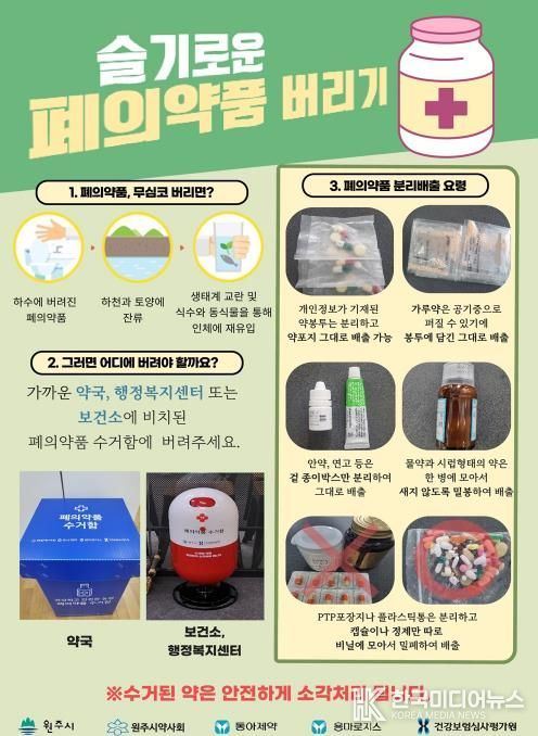 [ 한국미디어뉴스 이원영 기자 ] 원주시는 가정에서 배출되는 유통기한 지난 폐의약품을 안전하게 처리하기 위하여 올바른 분리배출 방법 홍보에 나섰다.