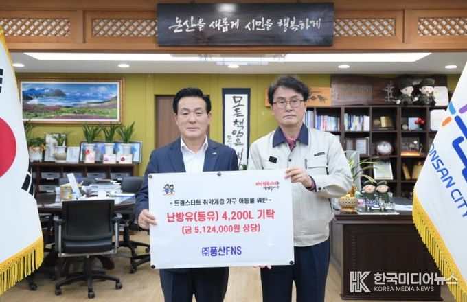 논산시는 15일 국방산업 전문기업 ㈜풍산FNS가 저소득 아동들을 위해 약 500만 원 상당의 등유 4,200리터를 기탁했다고 밝혔다.