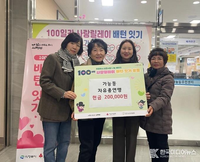 [ 한국미디어뉴스 김서안 기자 ] 의정부시 가능동주민센터는 12월 16일 가능동 자유총연맹이 관내 취약계층을 돕기 위해 성금 20만 원을 기탁하며 ‘100일간 사랑릴레이 배턴 잇기’에 참여했다고 밝혔다.