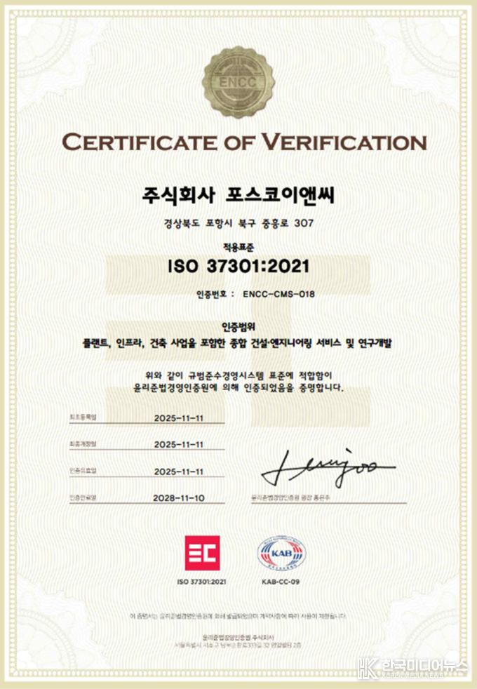 [ 한국미디어뉴스 이원영 기자 ] 포스코이앤씨가 윤리준법경영인증원으로부터 국제 공인 규범준수경영시스템(ISO 37301) 인증을 획득했다고 17일 밝혔다.