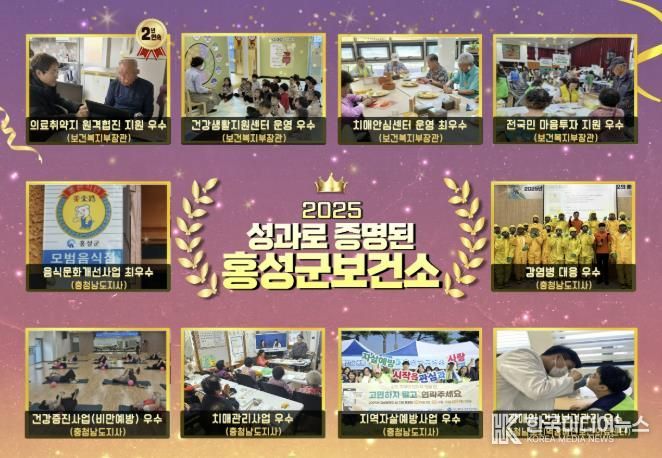 홍성군보건소는 2025년 중앙부처와 충청남도가 주관한 11개 분야 평가에서 우수기관에 선정되며 사업 기획력과 실행력을 동시에 인정받았다. 주요 수상내역으로는 ▲의료취약지 원격협진 지원사업 2년 연속 우수기관(보건복지부) ▲건강생활지원센터 운영 우수기관(보건복지부) ▲치매안심센터 운영 최우수기관(보건복지부) ▲치매관리사업 우수사례 공모전 맞춤형 사례관리 부문 우수상(보건복지부) ▲전국민 마음투자 지원사업 우수기관(보건복지부) ▲음식문화개선사업 평가 최우수기관(충청남도) ▲감염병 대응 우수기관(충청남도) ▲건강증진사업(비만예방) 우수기관(충청남도) ▲치매관리사업 우수기관(충청남도) ▲지역자살예방사업 우수기관(충청남도) ▲장애인 건강보건관리 우수기관(충청남도지역장애인보건의료센터)이 포함됐다.