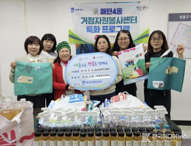 [ 한국미디어뉴스 이보영 기자 ] 수원시 매탄4동 자원봉사캠프 코치와 봉사회원들은 지난 12월 19일, 지역 상권 활성화와 마을 공동체 활성화를 위해 회원들이 직접 만든 장바구니와 EM(유용 미생물)을 매탄4동 행정복지센터에 전달했다.