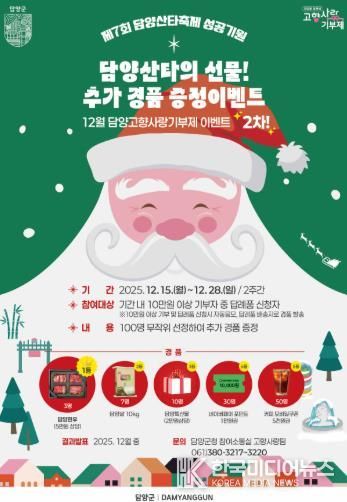 먼저 오는 28일까지 10만 원 이상 기부자 중 100명을 무작위 추첨해 담양한우, 쌀 등 지역 특산품을 증정하는 ‘담양산타의 선물 이벤트’가 진행된다.