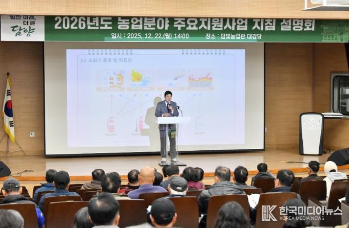 [ 한국미디어뉴스 이종철 기자 ] 담양군은 지난 22일 담빛농업관 대강당에서 관내 농업인을 대상으로 ‘2026년도 농업 분야 주요 지원사업 지침설명회’를 열고, 농업 분야 보조사업 전반에 대한 추진 방향과 세부 내용을 안내했다.
