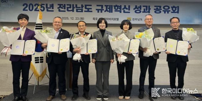 [ 한국미디어뉴스 이종철 기자 ] 전라남도는 23일 목포 샹그리아호텔에서 ‘2025 규제합리화 우수 시군 시상식’을 열고 한 해 규제 개선에 기여한 시군의 성과를 공유했다.