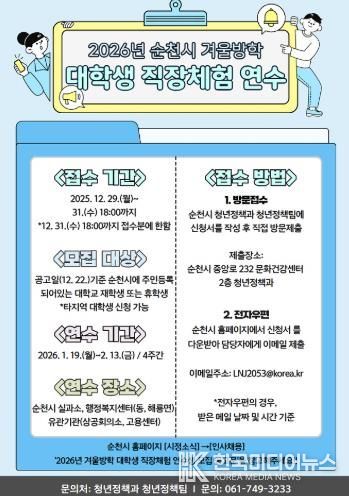 [ 한국미디어뉴스 이종철 기자 ] 순천시는 겨울방학을 맞아 대학생들에게 행정 현장 경험의 기회를 제공하기 위해 ‘2026년 겨울방학 대학생 직장체험 연수생’을 모집한다고 밝혔다.
