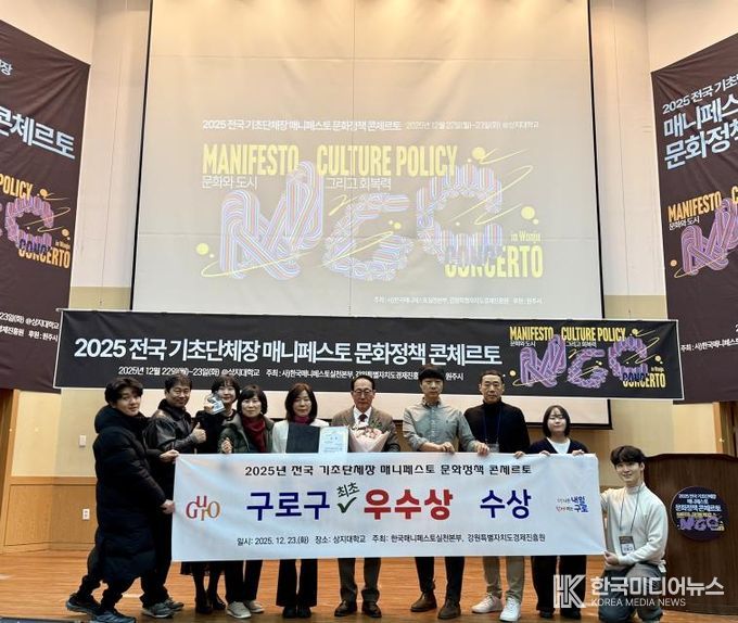 [ 한국미디어뉴스 이보영 기자 ] 구로구가 12월 23일 원주시 상지대학교에서 열린 ‘2025 전국 기초단체장 매니페스토 문화정책 콘체르토’ 본선 대회에서 ‘문화열차 959’ 사례로 문화기반도시활력 분야 우수상을 수상했다. 이번 수상은 도시 활력 회복을 위한 구의 문화정책 성과를 인정받은 결과다.