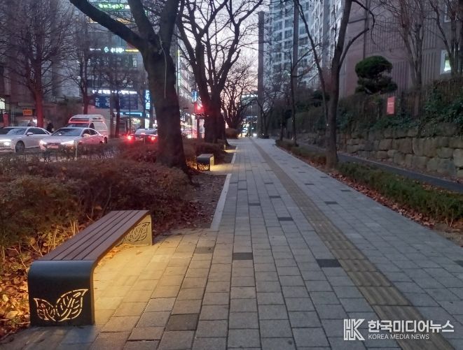 구는 설계 단계부터 주민들의 의견을 반영해 밤에도 아름다운 거리 분위기를 연출하고, 보행자 안전성 강화를 위하여 벤치 아래 은은한 조명등을 설치했다.