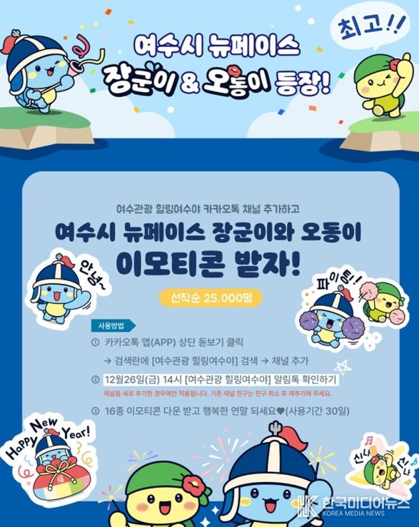 [ 한국미디어뉴스 이종철 기자 ] 여수시가 새롭게 리뉴얼된 마스코트 ‘장군이·오동이’ 카카오톡 이모티콘을 오는 26일 오후 2시부터 선착순 2만 5천 명에게 무료로 배포한다고 밝혔다.