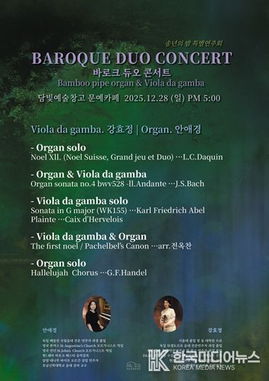 [ 한국미디어뉴스 이종철 기자 ] 담양군문화재단은 오는 28일 오후 5시 담빛예술창고 문예카페에서 『2025 담빛예술창고 송년특별연주회 ‘바로크 듀오 콘서트’』를 진행한다고 밝혔다.