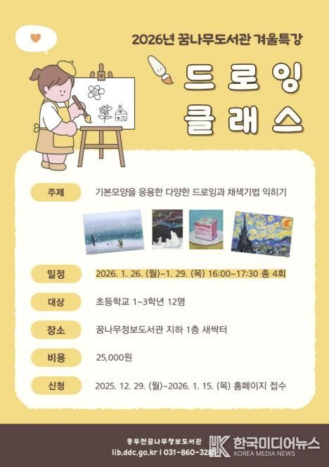 [ 한국미디어뉴스 김서안 기자 ] 동두천시 도서문화사업소 꿈나무정보도서관은 초등학생을 대상으로 한 2026년 겨울방학 특강 프로그램을 운영한다고 밝혔다.