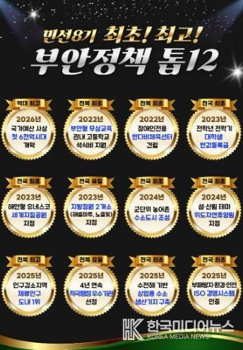 최초·최고 부안정책 톱12는 전국 최초·전국 유일·전북 최고 등 객관적이고 대외적으로 입증된 성과를 중심으로 선정됐으며 민선 8기 부안군정이 지향해 온 변화의 방향성과 정책 철학을 압축적으로 보여준다.