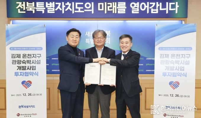 [ 한국미디어뉴스 이종철 기자 ] 전북특별자치도가 26일 도청 회의실에서 김제시, 베스트웨스턴플러스 김제호텔과 김제 온천지구 관광숙박시설 개발사업 투자협약(MOU)을 체결했다.
