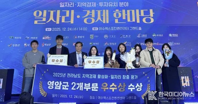 [ 한국미디어뉴스 이종철 기자 ] 영암군이 24일 여수엑스포컨벤션센터에서 열린 ‘2025년 전남 일자리·경제 한마당’에서 일자리 창출 우수상을 수상했다.
