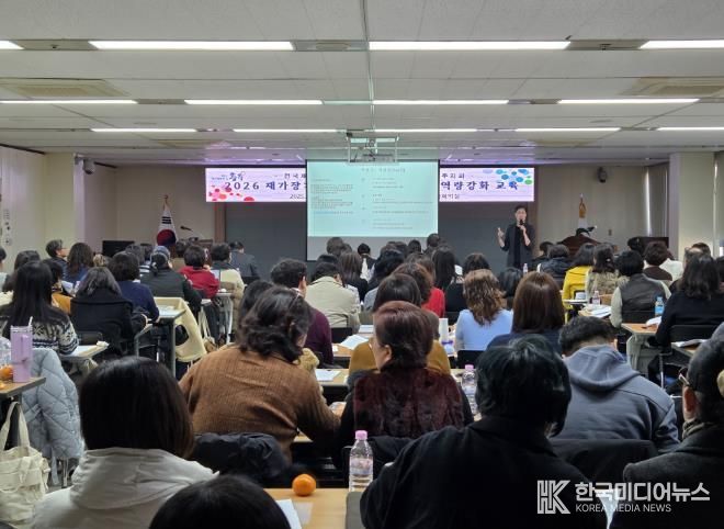 [ 한국미디어뉴스 김풍옥 기자 ] 전국재가장기요양기관연합회 충북지부 충주지회는 26일 충주시청 10층 중회의실에서 지역 재가장기요양기관 시설장과 사회복지사 등 100여 명을 대상으로 2026년을 대비해 ‘재가장기요양기관 평가교육 및 역량강화 교육’을 실시했다.