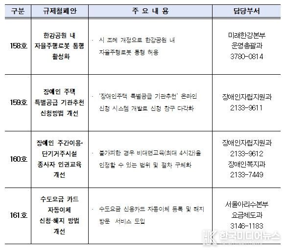 서울시는 내년 상반기 중으로 ▴한강공원 자율주행로봇 통행 허용(158호) ▴장애인주택 특별공급 기관추천 신청방법 개선(159호) ▴장애인시설 종사자 인권교육 개선(160호) ▴수도요금 카드 자동이체 개선(161호), 총 4건의 규제를 개선하겠다고 밝혔다.