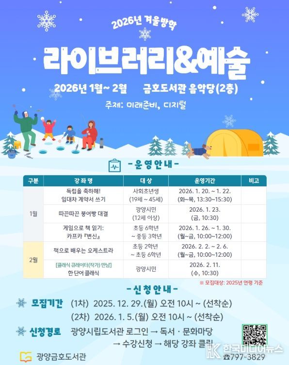 [ 한국미디어뉴스 이종철 기자 ] 광양금호도서관이 2026년 겨울방학 프로그램 ‘라이브러리·예술’ 수강생을 모집한다.