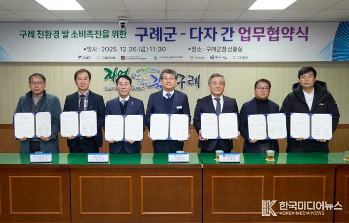 [ 한국미디어뉴스 이종철 기자 ] 구례군은 친환경 농업의 가치를 확산하고 쌀 소비 기반을 강화하기 위해 공공·금융·농협·민간이 참여하는 다자간 업무협약을 지난 12월 26일 군청 상황실에서 체결했다.