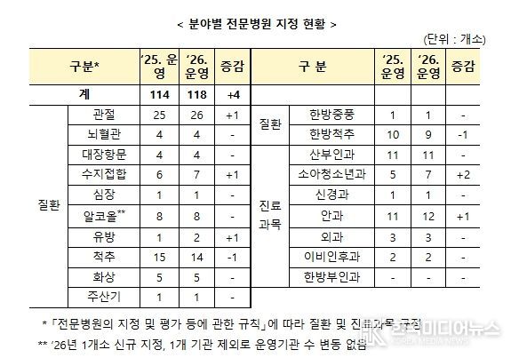 제5기 3차년도 전문병원 지정에 따라, 2025년 114개에서 2026년에는 118개 전문병원을 지정·운영하게 된다.