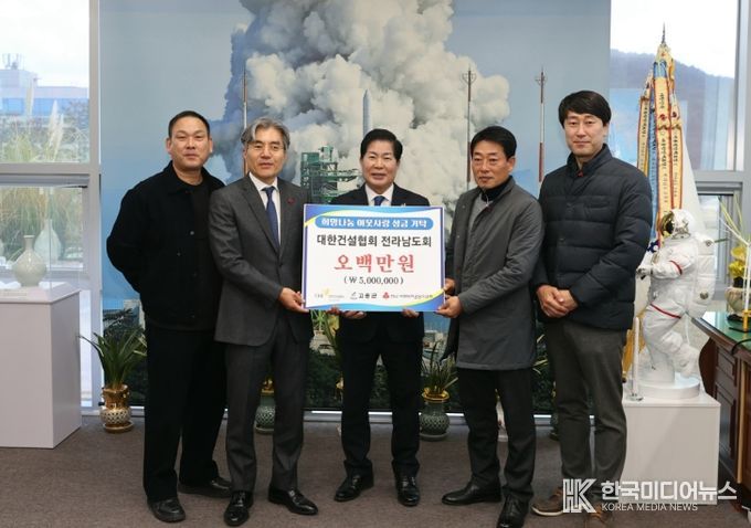 [ 한국미디어뉴스 이종철 기자 ] 고흥군은 지난 30일 연말연시를 맞아 대한건설협회 전라남도회(회장 박경재)로부터 지역 내 어려운 이웃을 돕기 위한 성금 500만 원을 기탁받았다고 밝혔다.