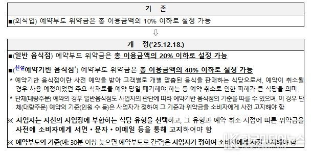이에 따라 분쟁조정 시 주방 특선(오마카세), 고급 식사(파인다이닝) 등 예약 기반 음식점과 대량 주문(또는 단체 예약)의 경우 총 이용금액의 40% 이하, 일반 음식점은 20% 이하를 기준으로 위약금을 설정할 수 있다.