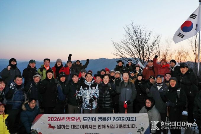 [ 한국미디어뉴스 이원영 기자 ] 김진태 강원특별자치도지사는 2026년 1월 1일 새해 첫 일정으로 도청 실국장 및 직원 30여 명과 함께 금병산에서 해맞이 산행을 진행했다.
